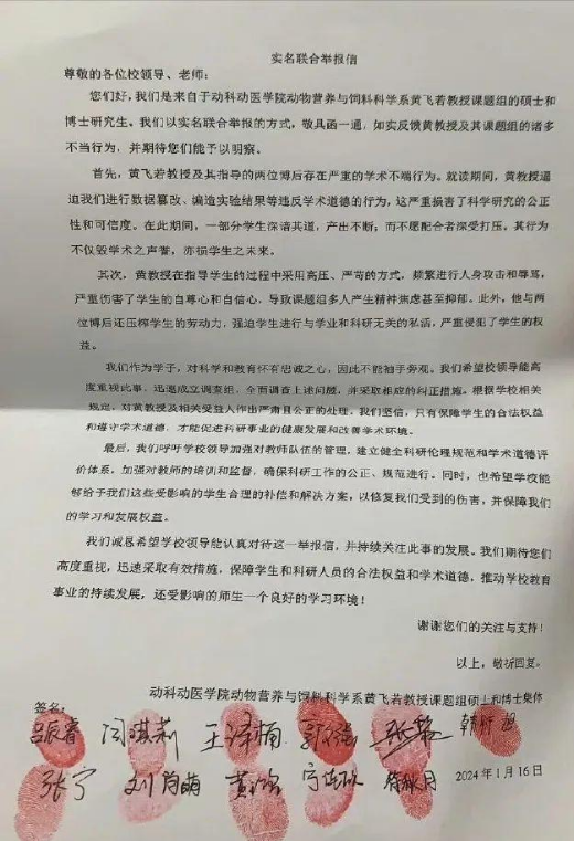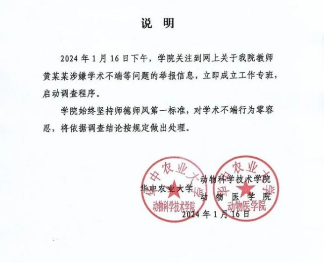 1月16日下午,华中农业大学动物科学技术学院关注到网上关于教师黄某某涉嫌学术不端等问题的举报信息,立即成立工作专班,启动调查程序。通报称,学院始终坚持师德师风第一标准,对学术不端行为零容忍,将依据调查结论按规定做出处理。