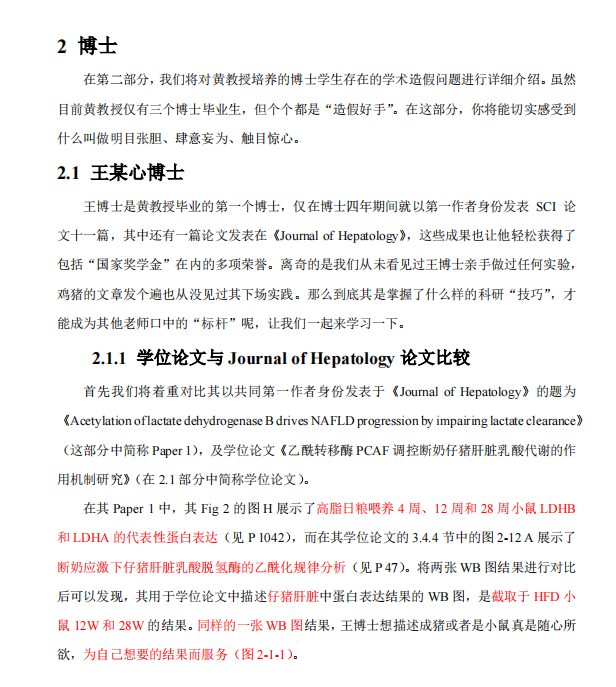 除了举报信,还有一份125页的PDF文档,详细列举了黄教授涉及学术不端的论文,条理清晰、详实,在科研实验中篡改编造数据、数据混乱重复使用。此外还打压学生、克扣劳务费、不当署名等,不仅违反了学术规范、也有违师德。